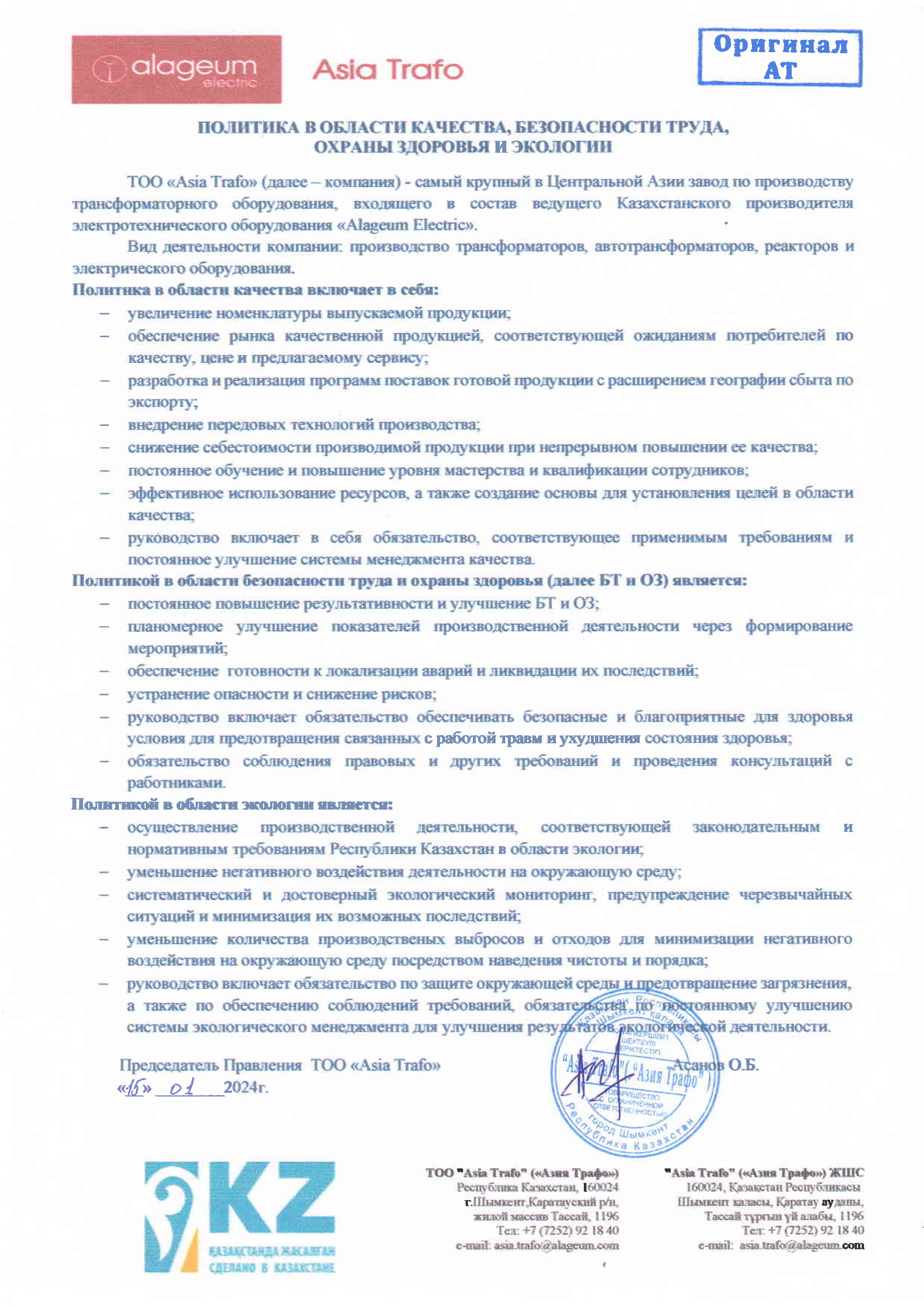 Политика в области качества, безопасности труда, охраны здоровья и экологии